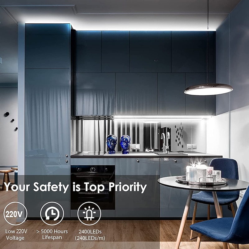 2M-30M COB LED Strip Light Plug in Flexible 220V Waterproof IP67 High Voltage Led Strip Multiple Colors 240LEDs/M Waterproof Led Light Strips for Bedroom Living Room Kitchen Furniture 13
