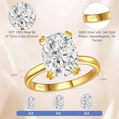 5CT Elongated Cushion Cut Engagement Ring for Women, S925 Sterling Silver Wedding Promise Cubic Zirconia Band, 14K Gold/White Gold Plated Anniversary Birthday Gifts for Her, Size 5-10 5