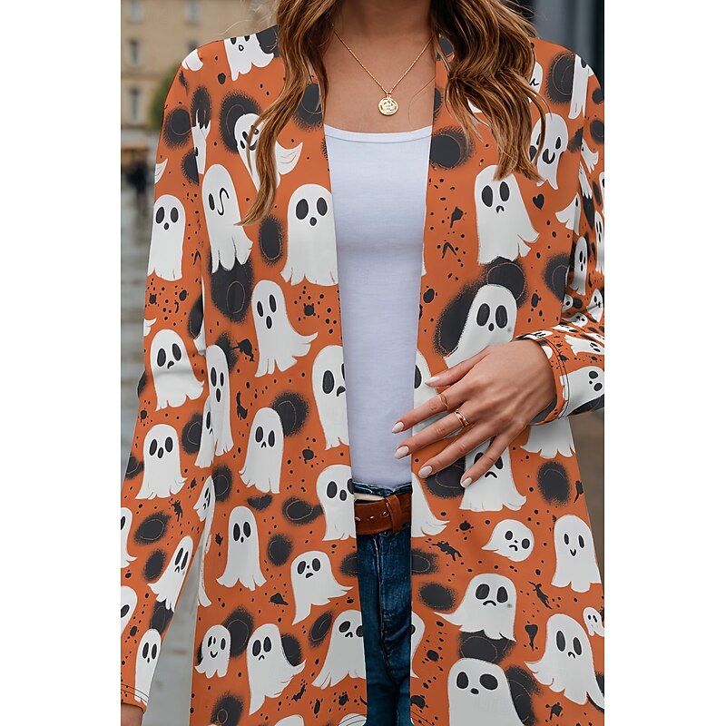 Halloween Women's Coat Lightweight Comfortable Pumpkin Print Vintage Artistic Casual Pumpkin Casual Long Collarless Loose Fit Long Sleeve Outerwear Black Pink Navy Blue Spring Fall 7