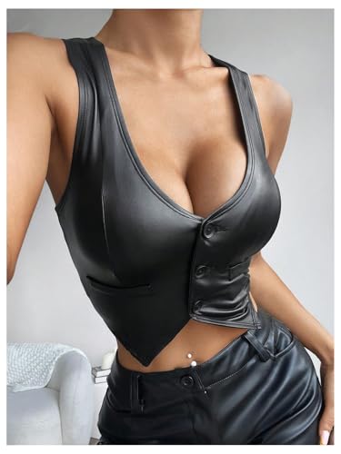 HOT ! Floerns Women's Sleeveless V Neck Button Front Faux Leather Waistcoat Y2k Crop Tank Top