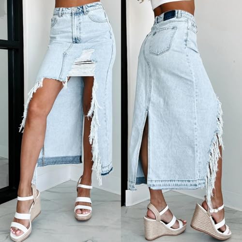 More information about Women's High Waisted Denim Skirt Asymmetrical Hem Split Ripped Frayed Raw Edge Midi Length Skirt with Pockets