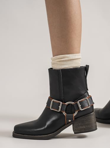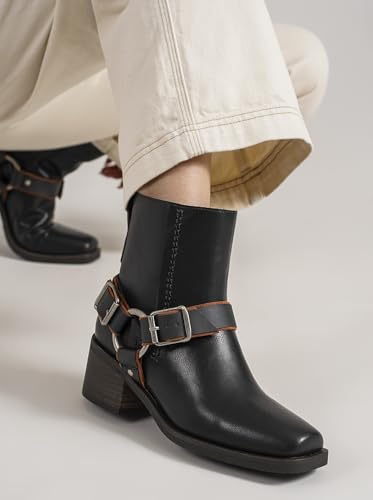 Women's Ankle Boots Motorcycle Boots Western Buckles Boots Stacked Heel Booties Square Toe Boots Fashion Riding Biker Boots 4