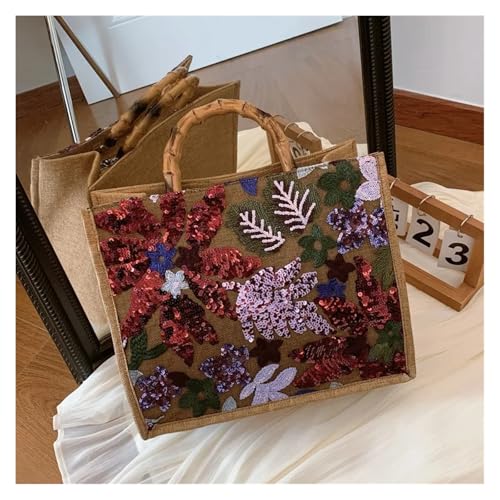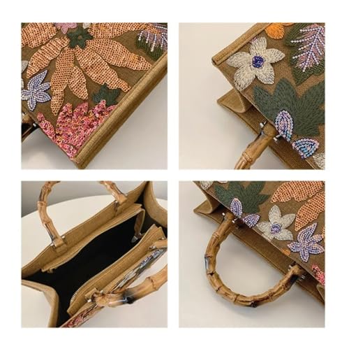 More information about Sequins Embroidery Tote Bag Vintage Bamboo Handle Women Handbags Casual Linen Summer Beach Large Capacity Shopper Purse
