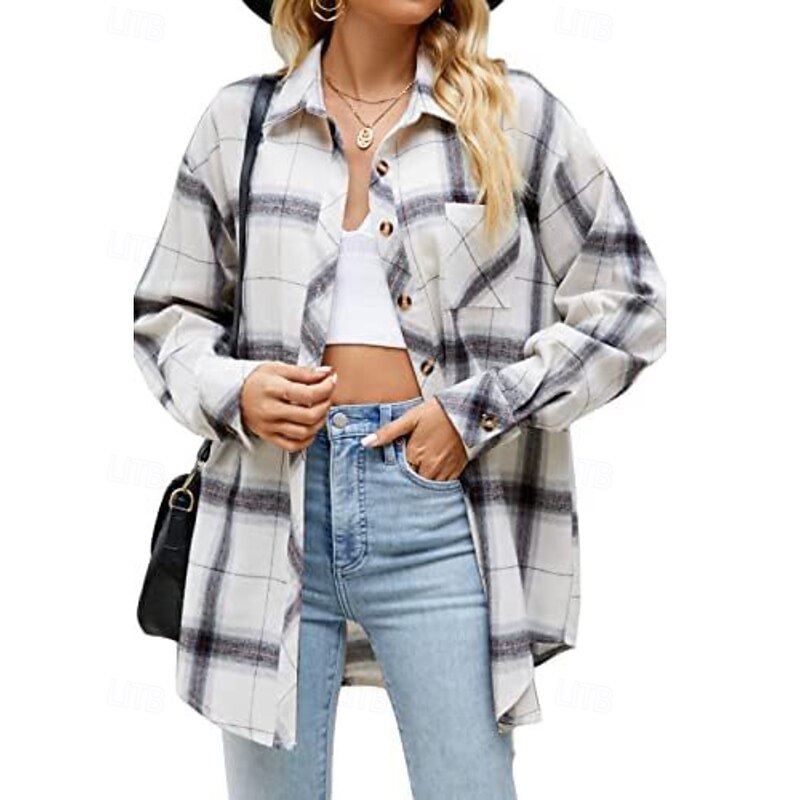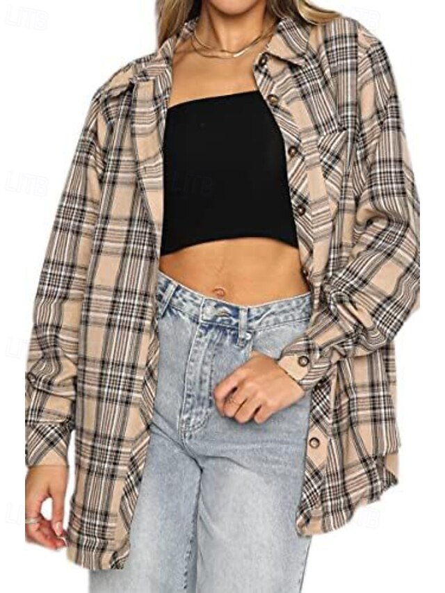 More information about Women's Shirt Blouse Plaid Modern Casual Long Sleeve Shirt Collar Regular Tops Holiday Going out Buttons Print Black White Pink Light Brown Brown Fall