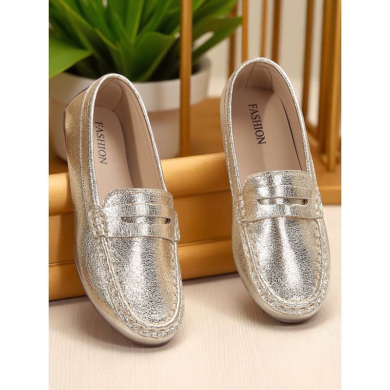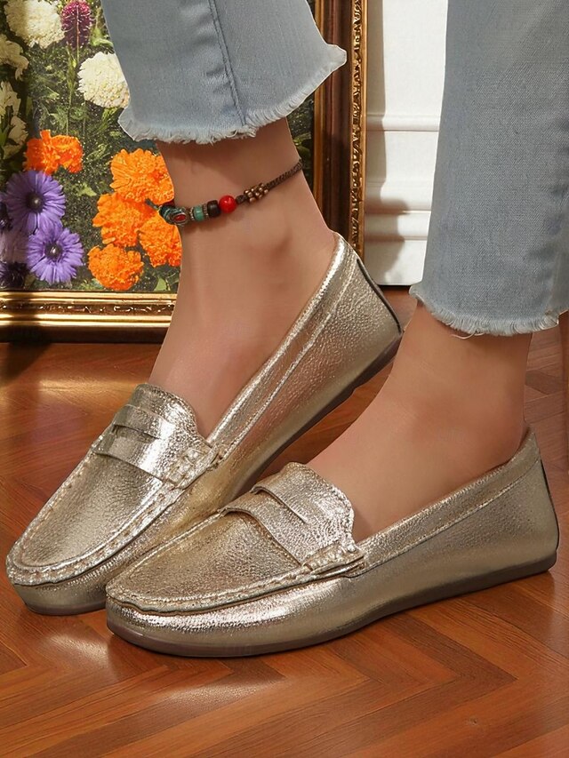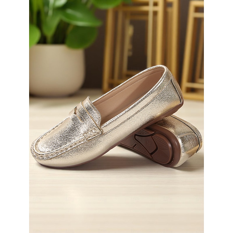 HOT ! Women's Metallic Gold Penny Loafers, Soft Slip-On Casual Flats with Textured Faux Leather for Stylish Outfits and Daily Dates