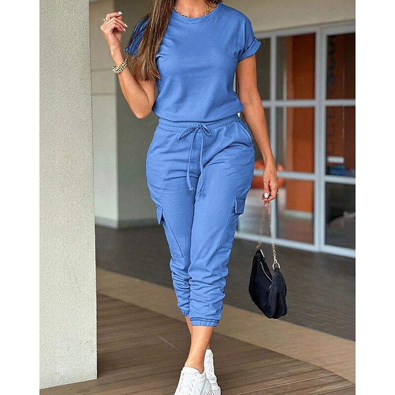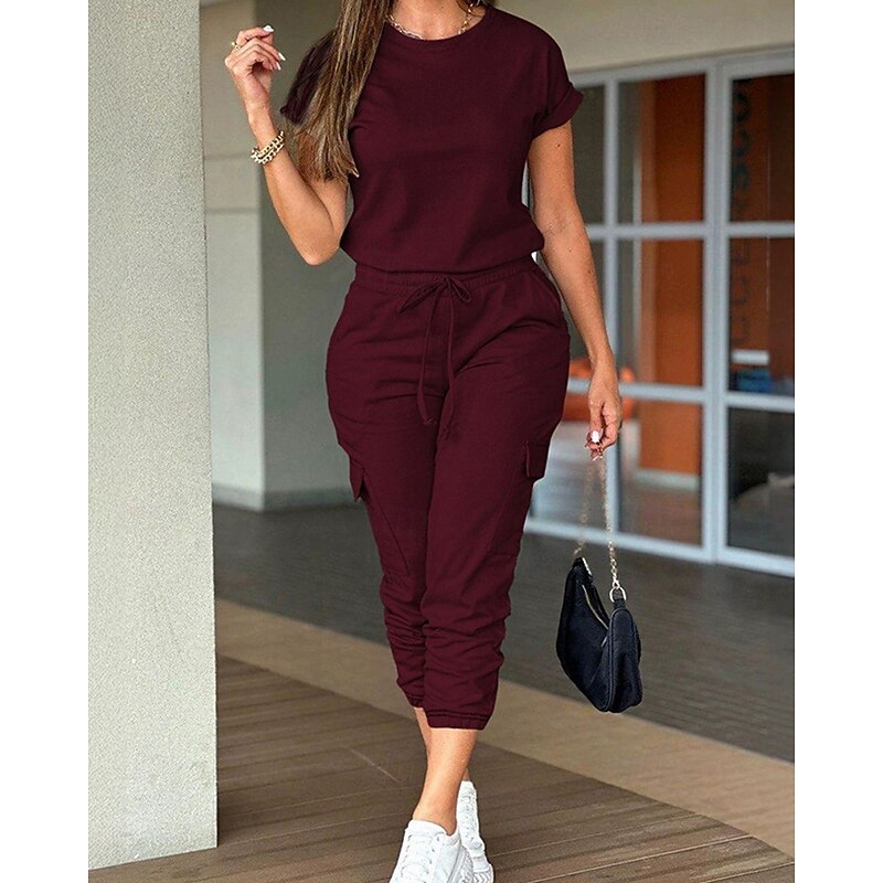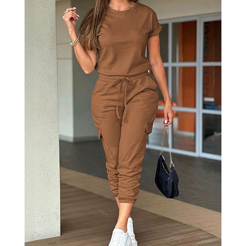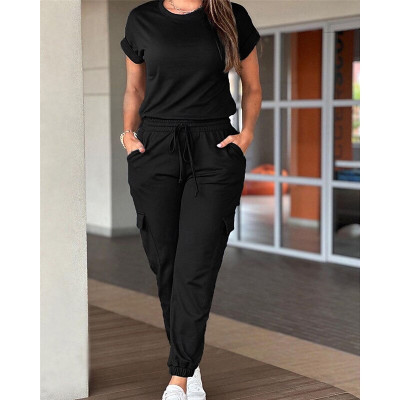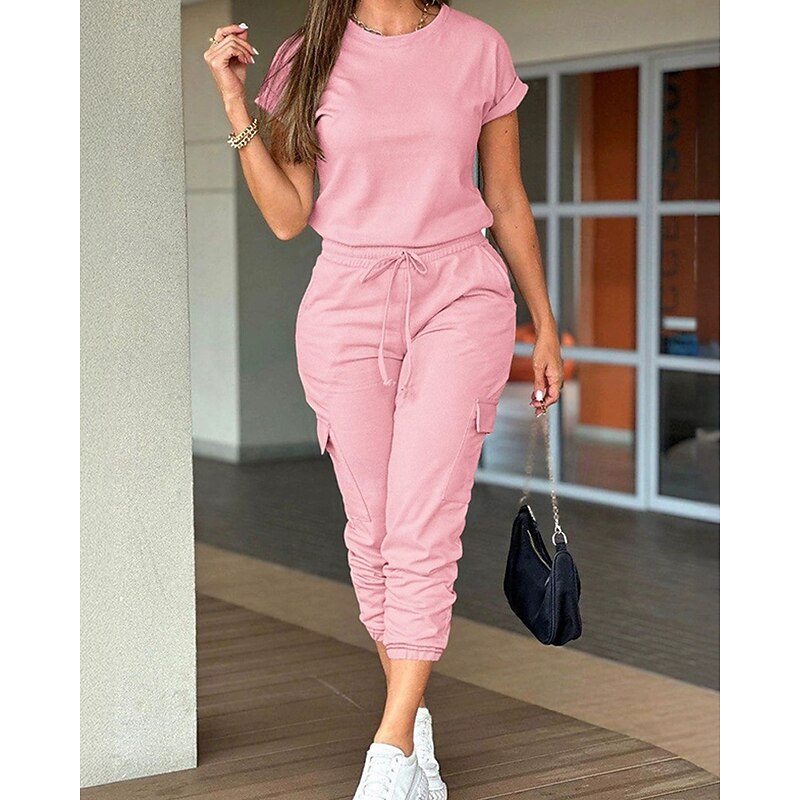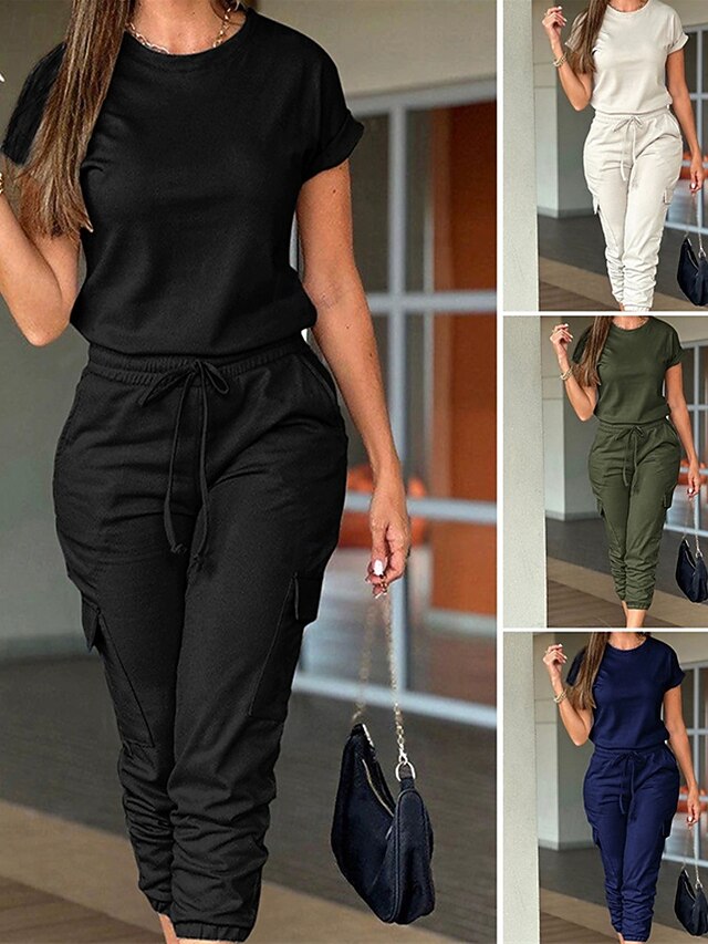 HOT ! Women's Normal Jumpsuit Streetwear Solid Color Short Sleeve Crew Neck Drawstring Pocket Street Daily Regular Fit Black Light Green Pink Fall
