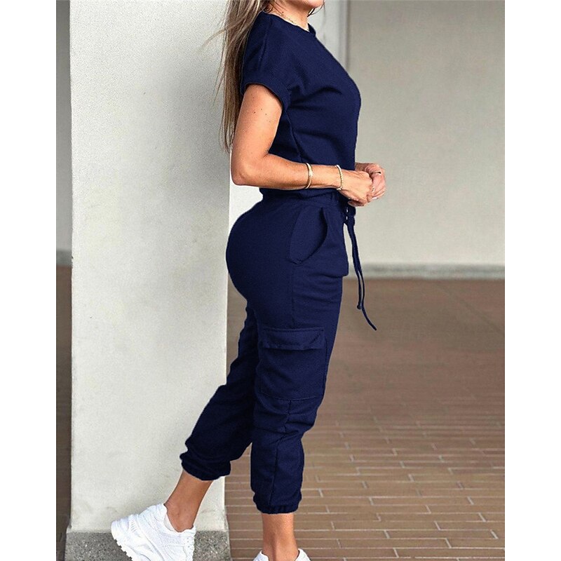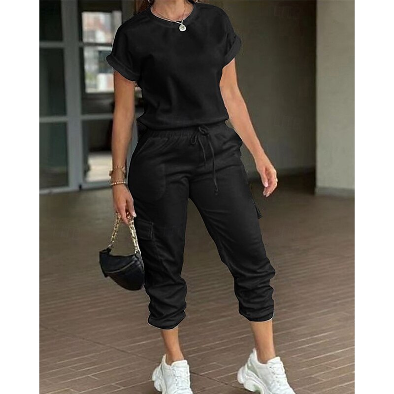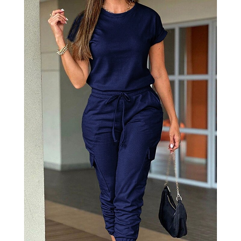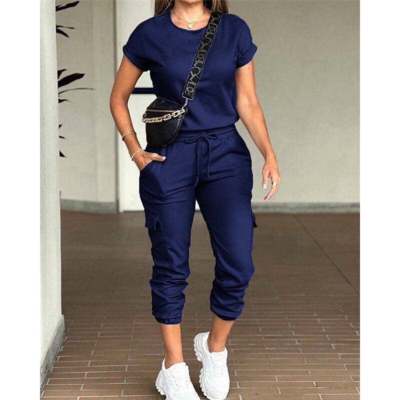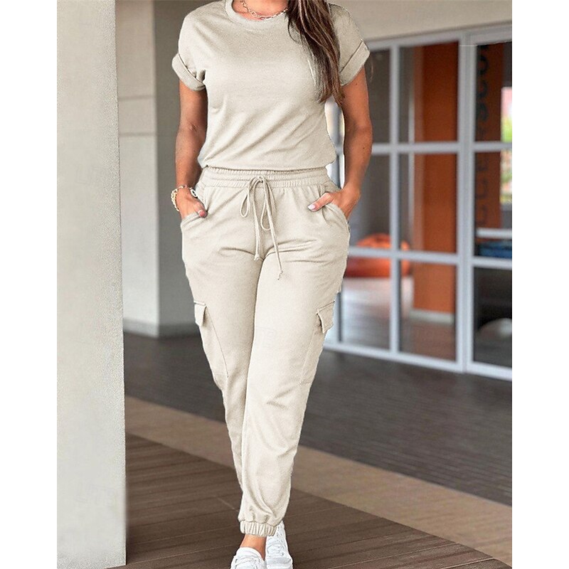 HOT ! Women's Normal Jumpsuit Streetwear Solid Color Short Sleeve Crew Neck Drawstring Pocket Street Daily Regular Fit Black Light Green Pink Fall