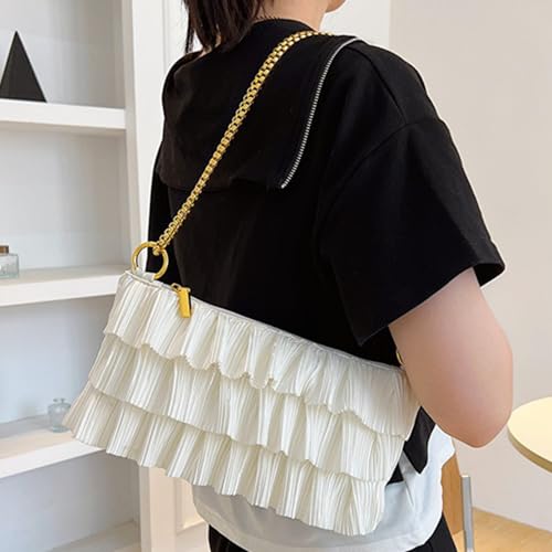 HOT ! Women Crossbody Bag Fringe Ruffled Layered Pleated Chain Strap Casual Daily Shoulder Purse White Lightweight Multi-Pocket Design for Travel Shopping Party
