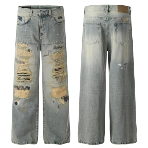HOT ! Jeans Pants Trousers Denim Street Trendy Washed Dirty Hole Loose Straight Leg for Men