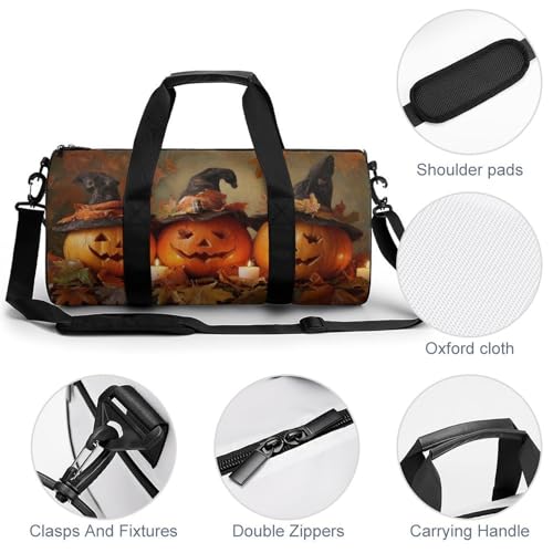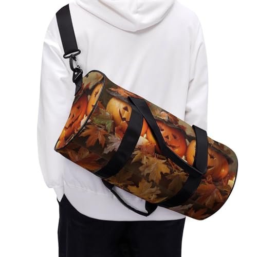 HOT ! Pumpkins Witch Hats Candles Autumn Leaves Travel Gym Bag for Women Men Cylindrical Duffle Bag Sport Workout Bag with Shoulder Strap