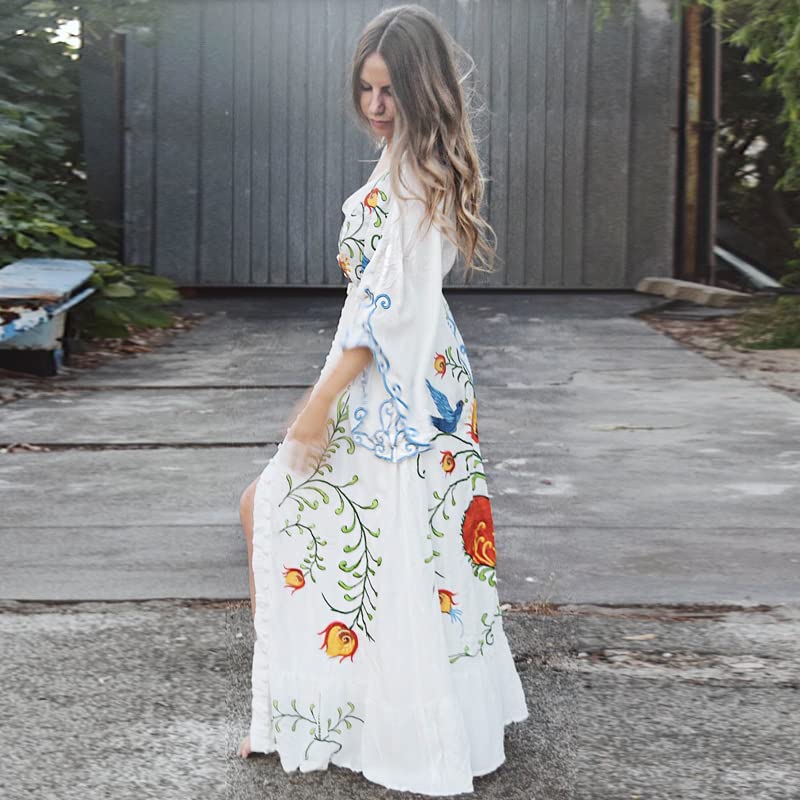 More information about Runway Bohemia Lomg Dress Summer Women Cotton Embroidery Floral Batwing Sleeve V Neck Beach Long Dress