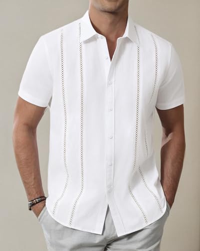 • Cuban Guayabera Design:guayabera shirts features short sleeve, spread collar, button closure, cutout embroidery, relaxed fit. Distinct cuban design makes this shirt more fashionable and classic