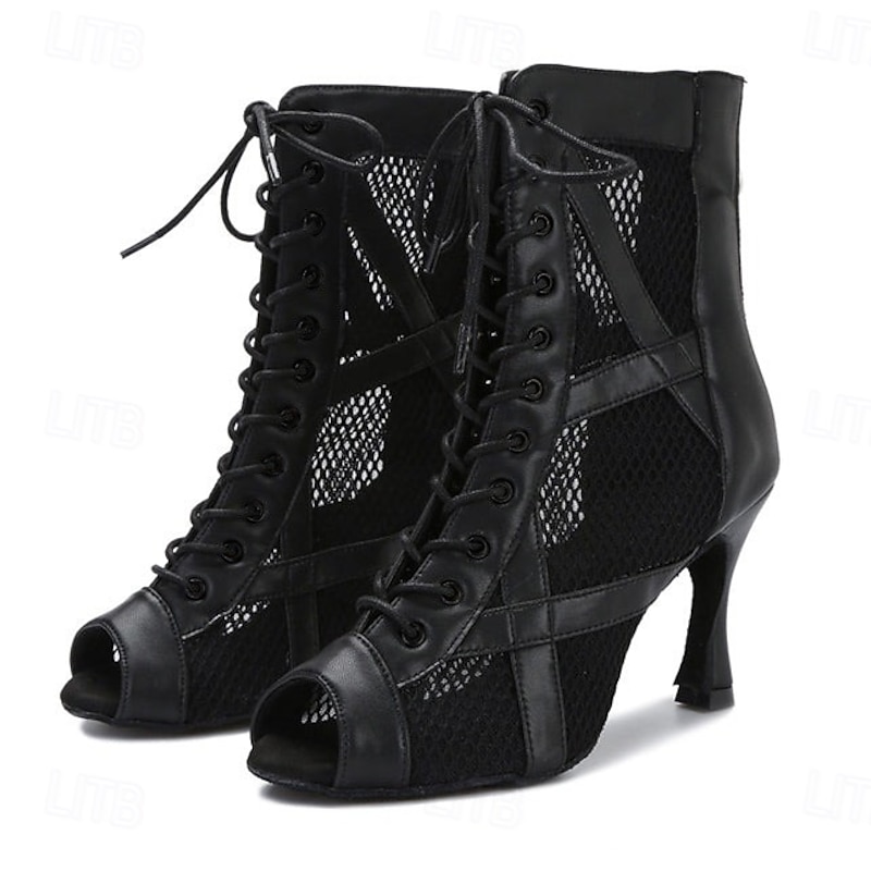 Highlights [Fabric] : Crafted from a combination of PU leather and mesh, these women's dance boots offer a unique blend of style and functionality. The mesh panels enhance breathability, ensuring your feet stay comfortable even during warm weather. [Fit] : Designed as ankle boots, they feature a sleek lace-up front and a convenient zipper closure for an adjustable and secure fit. The slim, tapered Cuban heel, measuring 3 1/4 inches (8.3 cm), adds height while maintaining stability. [Design Highlights] : With a chic peep-toe style, these boots incorporate a fashionable blend of materials. The combination of mesh and synthetic leather provides a contemporary look, while the suede outsole ensures flexibility and ease of movement, making them perfect for dancing. [Occasions] : Ideal for professional settings or elegant occasions, these boots make a bold fashion statement. Their sophisticated style is well-suited for nights out, formal events, and dance performances, offering both comfort and durability. [Size Range] : Available in a wide range of sizes, from 34 to 43, catering to different foot shapes and ensuring a perfect fit for adult women seeking stylish and professional dance footwear.