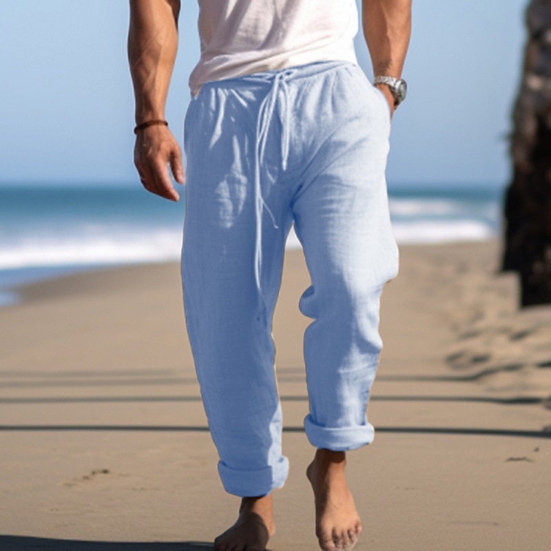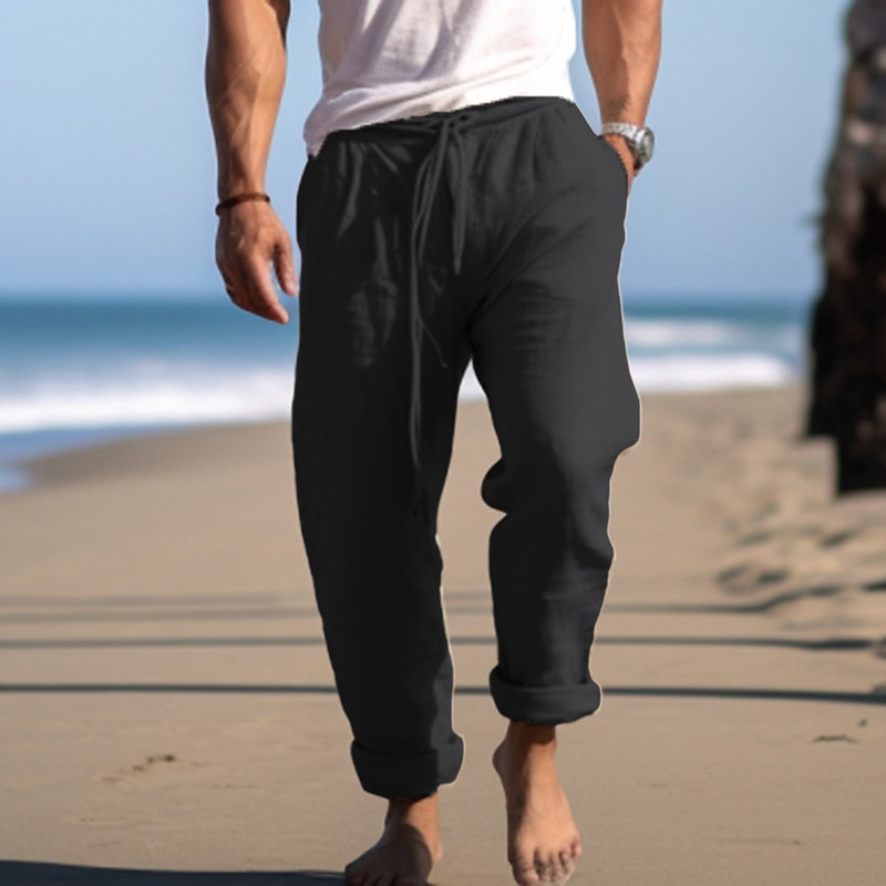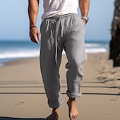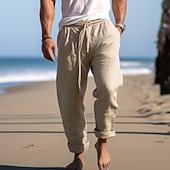Highlights [Fabric] : Crafted from a lightweight and breathable linen cotton blend, these men's pants are perfect for keeping cool and comfortable during warm spring and summer days. The soft fabric ensures a relaxed and easy-going feel, making them an essential addition to your warm-weather wardrobe. [Fit] : These pants boast a regular fit with a straight-leg cut that provides a laid-back and timeless silhouette. The mid-waist design and adjustable elastic waistband with a drawstring closure ensure a comfortable and customized fit for any occasion. [Design Highlights] : Featuring a classic plain pattern and rolled-up cuffs, these trousers offer a stylish yet understated look. The natural linen fabric is available in a range of colors including Green, White, Black, Sky Blue, Grey, and Khaki, providing versatility for pairing with different tops. [Occasions] : Ideal for daily wear, going out, or outdoor activities, these casual and fashion-forward pants can effortlessly transition from a relaxed day at the beach to an evening gathering. Their breathable and soft nature makes them a versatile choice for various occasions. [Size Range] : Available in sizes S, M, L, XL, 2XL, and 3XL, these linen pants cater to a wide range of body types, ensuring a flattering fit for everyone.