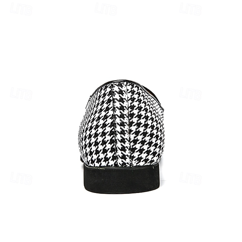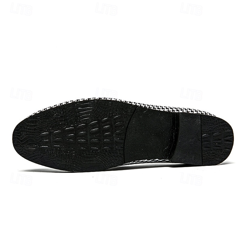 Highlights [Fabric] : These elegant loafers are crafted from a durable woven fabric for the upper, ensuring both breathability and style. The sleek, black and white houndstooth pattern adds a touch of sophistication, while the striking red PU lining offers a luxurious contrast. [Style] : Designed with a classic slip-on silhouette, these loafers combine convenience with comfort. The rounded toe shape ensures comfortable wear for extended periods, making them ideal for various occasions. [Design Highlights] : The standout feature of these loafers is the decorative red tassel embellishment, which complements the vivid red interior lining. The loafers also include a sleek buckle detail for an added touch of elegance. [Occasions] : Perfect for weddings, parties, and other formal or semi-casual occasions, these loafers effortlessly blend classic charm with modern style. Their versatile design makes them a valuable addition to any man’s wardrobe. [Size Range] : Available in a comprehensive size range from US 6 to US 11.5, these loafers are designed to accommodate a variety of foot sizes, ensuring a perfect fit for comfort and style.