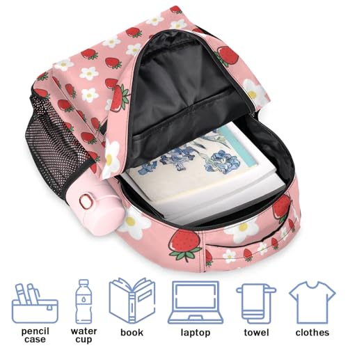 Strawberry Backpack For Girl - Cute Pink Schoolbag For Kid with Double Zipper, Breathable Shoulder Strap & Side Pocket for Water Bottle, Travel Pack for Kids Women Children Teens 1