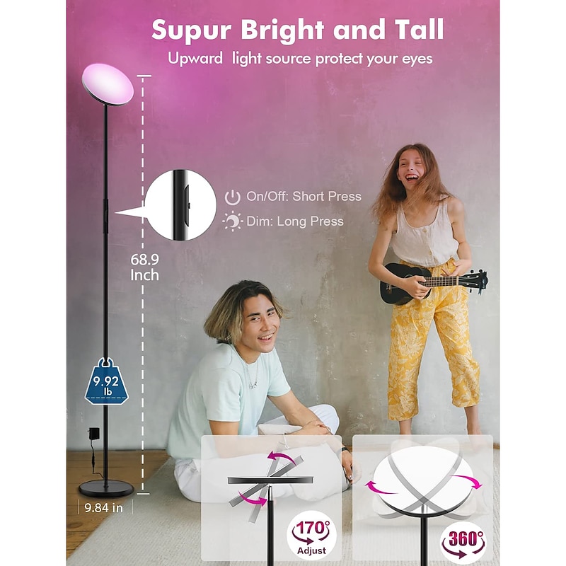Smart RGB Floor Lamp Works with Alexa Google Home, WiFi Remote Modern Tall Standing Light, Super Bright 2000LM Color Dimmable for Living Room, Bedroom (Black) 10