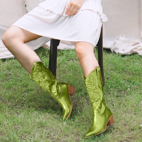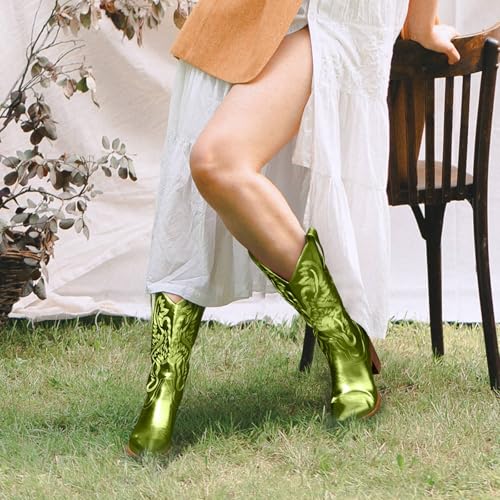 Women's Cowboy Boots Metallic Mid Calf Cowgirl Boots Wide Calf Western Embroidered Sparkly Paty Boots 5