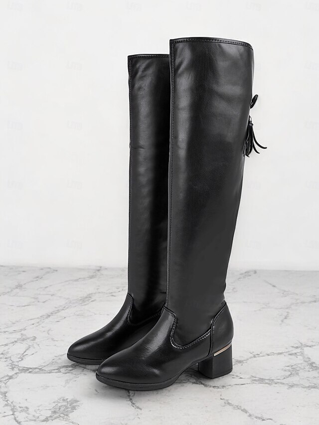Highlights [Fabric] Crafted from high-quality faux leather, these black over-the-knee boots offer a sleek and durable addition to your winter wardrobe. The material ensures a smooth finish with subtle stitching that enhances the refined look of the boots. [Silhouette] Featuring a classic round toe and a chunky block heel, these boots are designed for both comfort and style, providing stability during all-day wear. The thigh-high design adds a touch of elegance and sophistication to any outfit. [Design Highlights] These boots are equipped with a concealed side zipper for easy wear, along with a chic tassel embellishment that adds a touch of flair. The understated yet stylish design makes them suitable for both casual and more formal occasions. [Occasions] Perfect for work, office settings, and evening outings, these boots are versatile enough to be paired with a variety of outfits. Whether you're dressing up for business or going for a minimalist style, they complement a range of ensembles. [Size Range] Available in a variety of sizes ranging from US5.5 to US10.5, these boots cater to different foot sizes, ensuring a comfortable and tailored fit for every wearer.