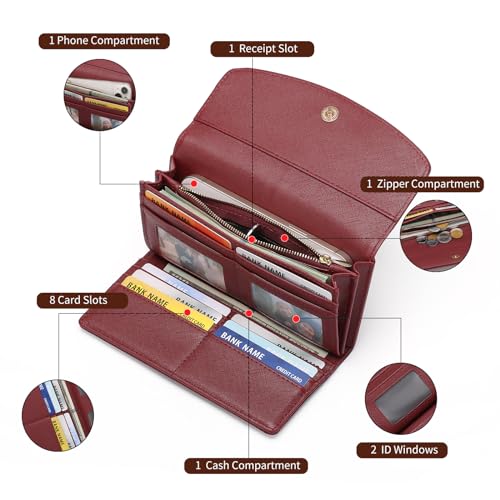 Large Capacity Genuine Leather Wallet for Women RFID Blocking Clutch with Zipper Pocket (Dark Burgundy) 6