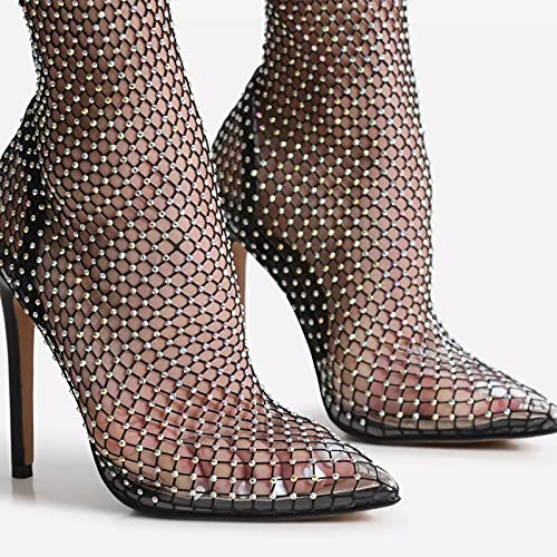 Women Bling Rhinestones Multi Colour Diamante Detail Stiletto Heel Ankle Sock Boot In Black Fishnet Pointed Toe Heeled Sandals Shoes 6