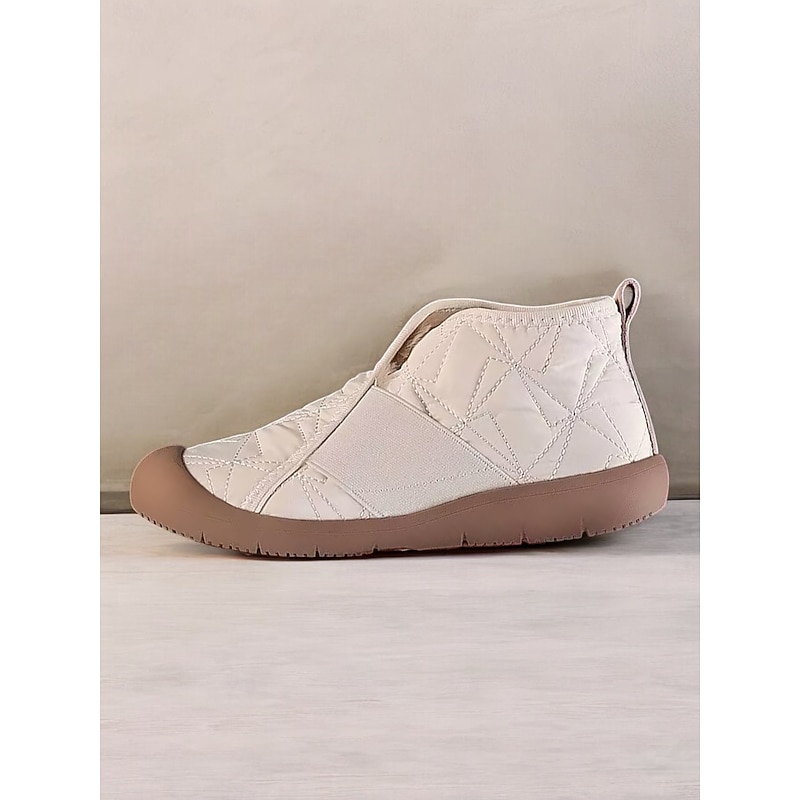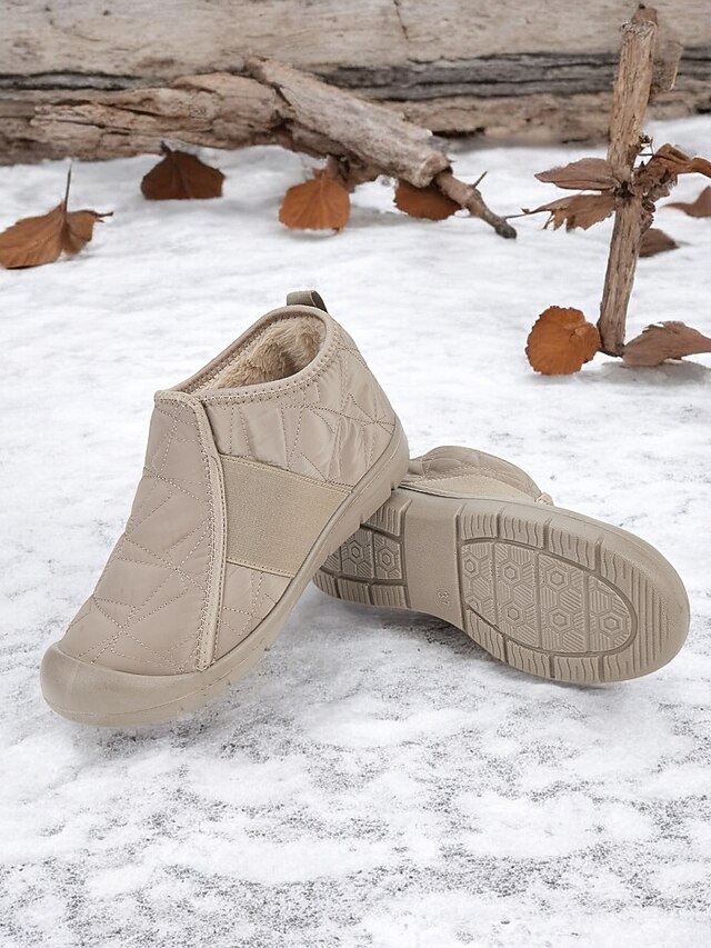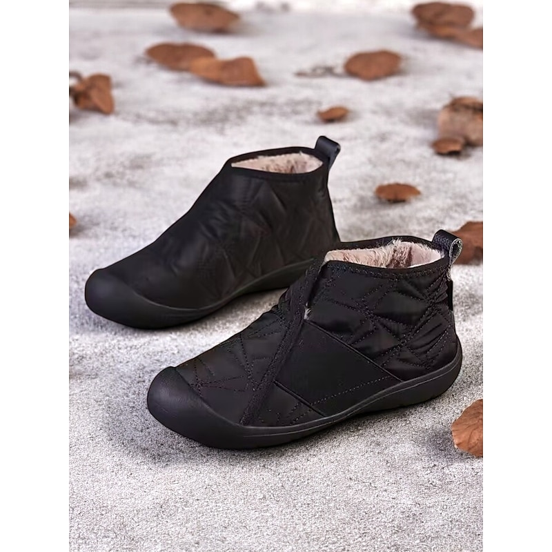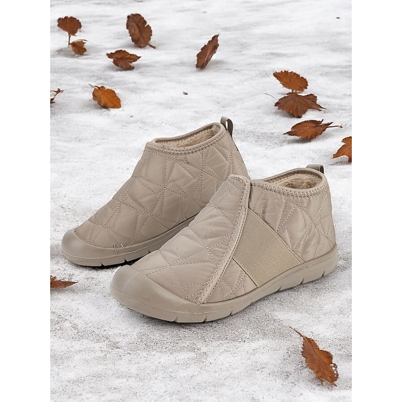 Highlights [Fabric] : Crafted with a quilted exterior made from soft cloth, these women's winter shoes are specially designed to provide warmth and comfort. The lining features a plush, fleece-like fabric that ensures cozy wear even in the coldest weather. The upper material offers durability and a water-resistant finish, ideal for light rain or snowfall. [Fit] : These slip-on boots are characterized by a flat heel style, enhancing everyday comfort and ease of wear. The elastic side panels allow for flexible movement and a secure fit, making them practical for various outdoor activities. [Design Highlights] : These shoes feature a minimalist, casual aesthetic with a touch of elegance. The plush, fleece-lined interior and sturdy rubber outsole provide both warmth and excellent traction. The round toe shape adds to the overall comfort and roomy feel, making these booties perfect for daily wear. [Occasions] : Ideal for daily winter outings, casual gatherings, and any cold-weather adventures. With their blend of functionality and style, these boots offer a fashionable and practical solution for weekend trips, holiday festivities, or simply a stroll in chilly weather. [Size Range] : Available in a variety of sizes, these boots cater to women's US sizes 5.5 to 10.5, ensuring a perfect fit for a wide range of foot sizes. Whether you're looking for a snug fit or something with a bit more room, these boots provide an option for every preference.