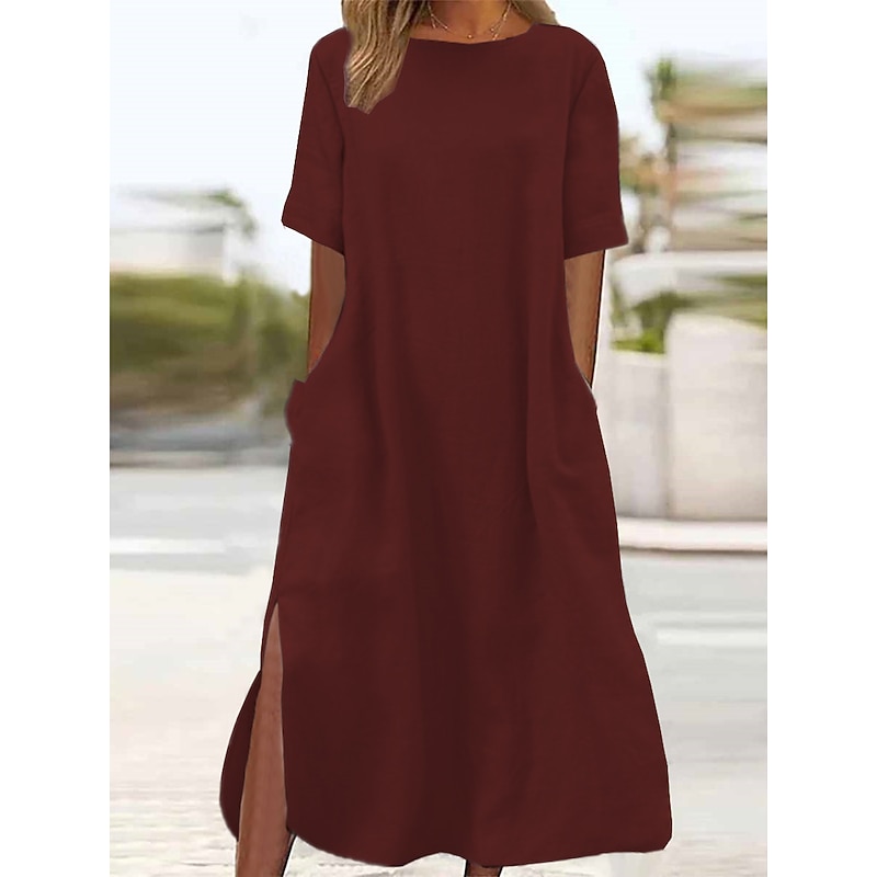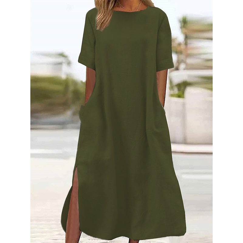 HOT ! Women's ArmyGreen Black Wine Summer Spring Maxi long Dress Linen-Inspired Dresses Casual Dress Daily Basic Casual Home Daily Beach Loose Fit Plain Crew Neck