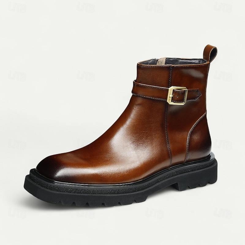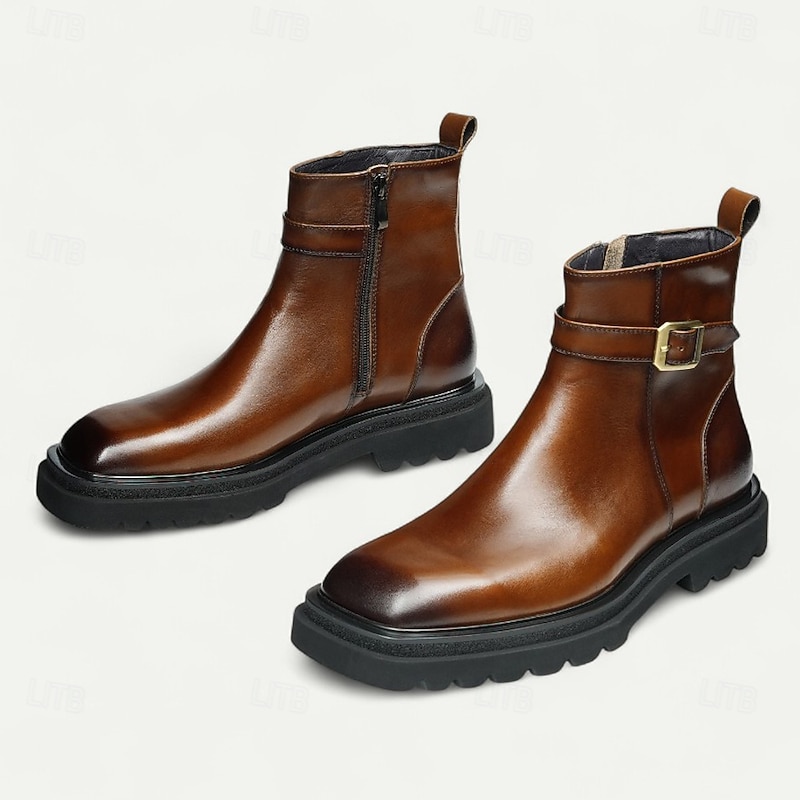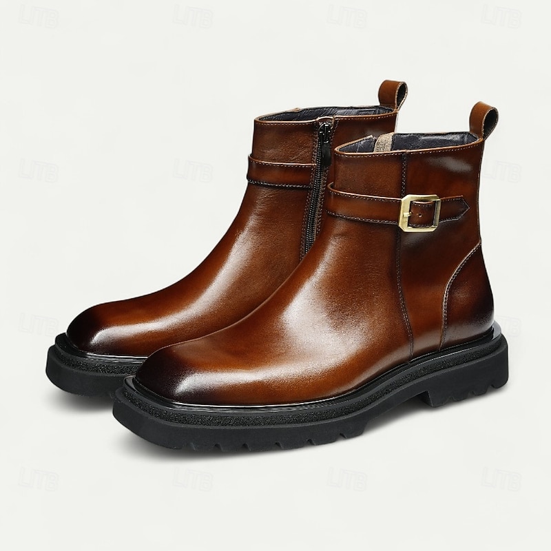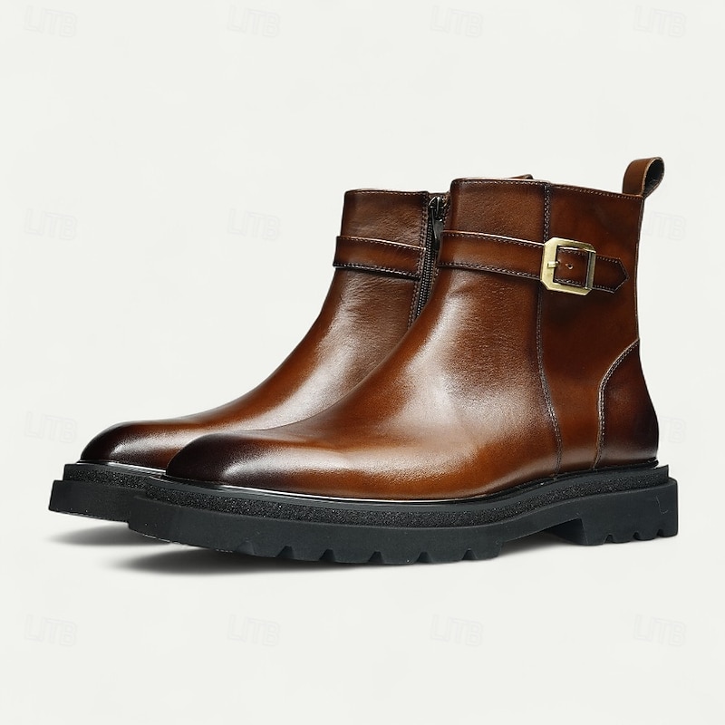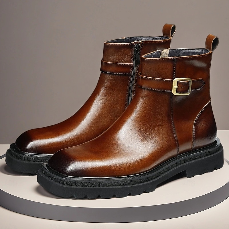 HOT ! Men's Brown Buckle Ankle Boots Classic Side Zip Casual Boots with Decorative Strap for Office, Parties and Daily Outfits