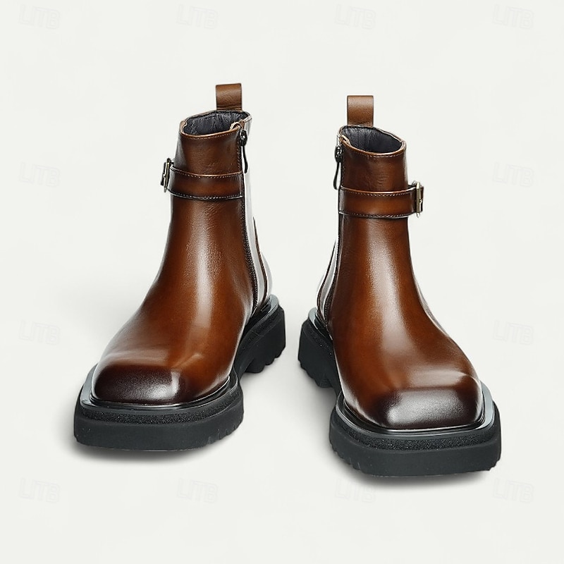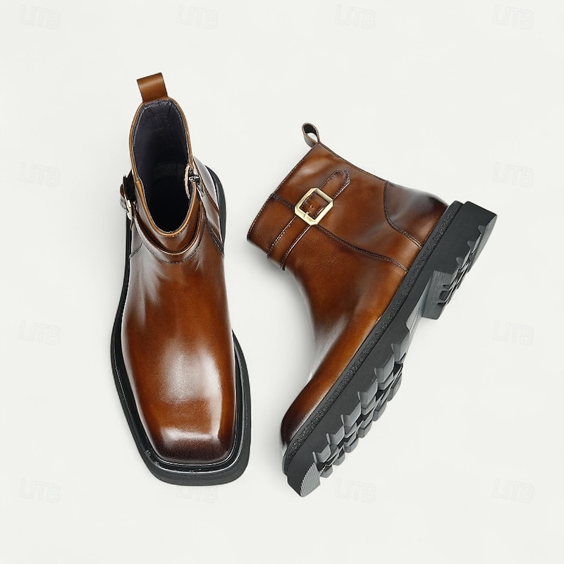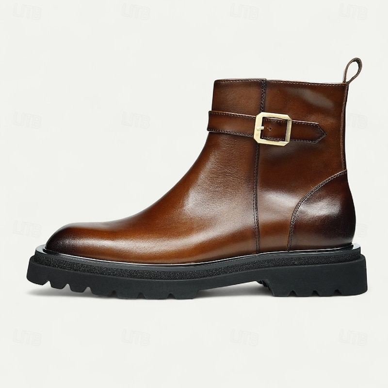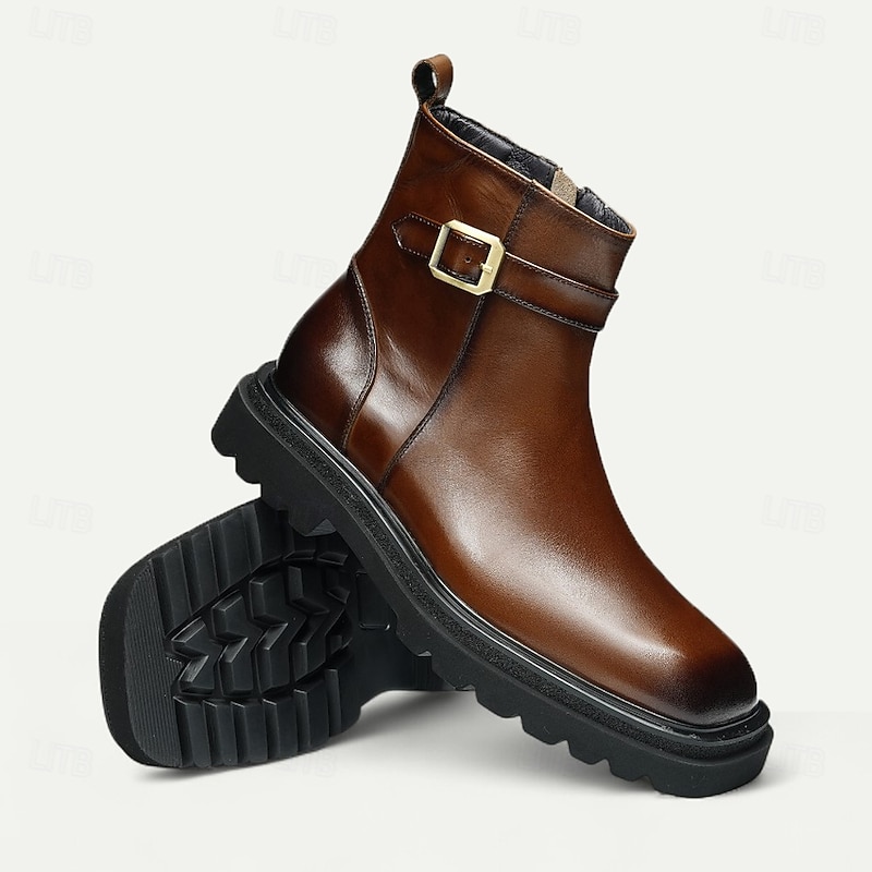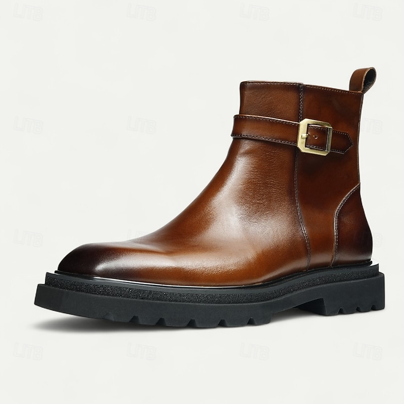 HOT ! Men's Brown Buckle Ankle Boots Classic Side Zip Casual Boots with Decorative Strap for Office, Parties and Daily Outfits