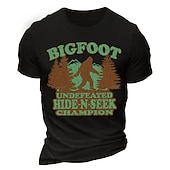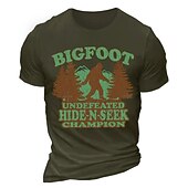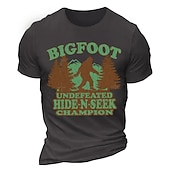 : Featuring a playful and eye-catching front design, the T-shirt showcases a Bigfoot graphic set against a backdrop of trees, accompanied by the humorous text "BIGFOOT UNDEFEATED HIDE-N-SEEK CHAMPION." The earthy brown and green tones contribute to a fun and whimsical touch, making it a standout piece.