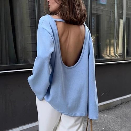 HOT ! Low Back Loose Knit Long Sleeve Sweater Scoop Draped Backline Side Curve Hem Pullover Minimalist Knitwear
