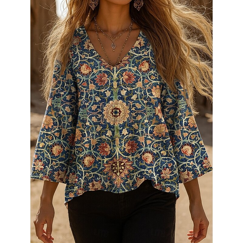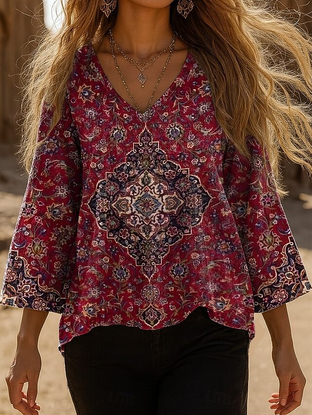 More information about Women's Blouse Graphic Paisley Bohemia Vintage Stylish 3/4 Length Sleeve V Neck Regular Tops Daily Black Red Blue Fuchsia Green Summer Spring Fall