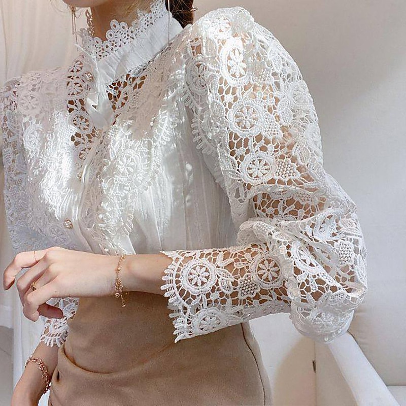 Women's Lace Shirt Blouse Eyelet top White Lace Shirt Solid Colored Elegant Fashion Elegant & Luxurious Shirt Collar Daily Hole Black White Apricot Spring Fall Winter Fall & Winter 7