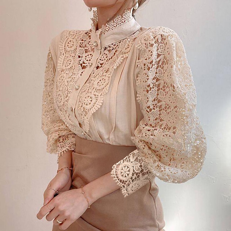 HOT ! Women's Lace Shirt Blouse Eyelet top White Lace Shirt Solid Colored Elegant Fashion Elegant & Luxurious Shirt Collar Daily Hole Black White Apricot Spring Fall Winter Fall & Winter
