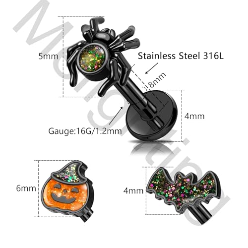 MeIighting 3PCS 16G Black Helix Earrings, 8 mm Internally Threaded Bat Cartilage Piercing Stainless Steel 316L, Halloween Pumpkin Spider Tragus Flat Back Lobe Stud For Women 6