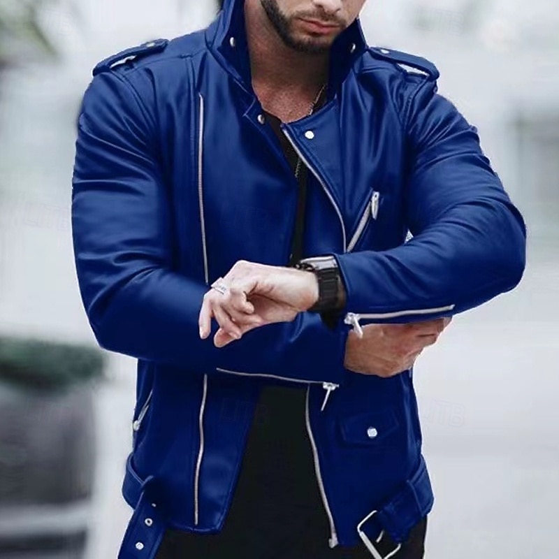 This jacket features an eye-catching asymmetrical front zipper, a hallmark of classic biker style. Additional design elements like the shoulder epaulets, multiple functional zippers, and a waist belt enhance its edgy, fashionable look. The turndown collar adds a sophisticated touch, perfect for any outdoor or streetwear ensemble.