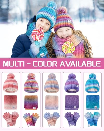 Kids Winter Beanie Gloves Scarf Set,Girls Toddler Winter Hat With Pom Neck Warmer Gaiter Mittens Fleece Lined Set 3