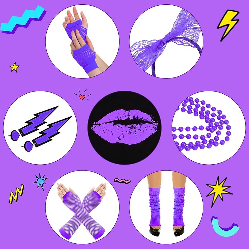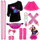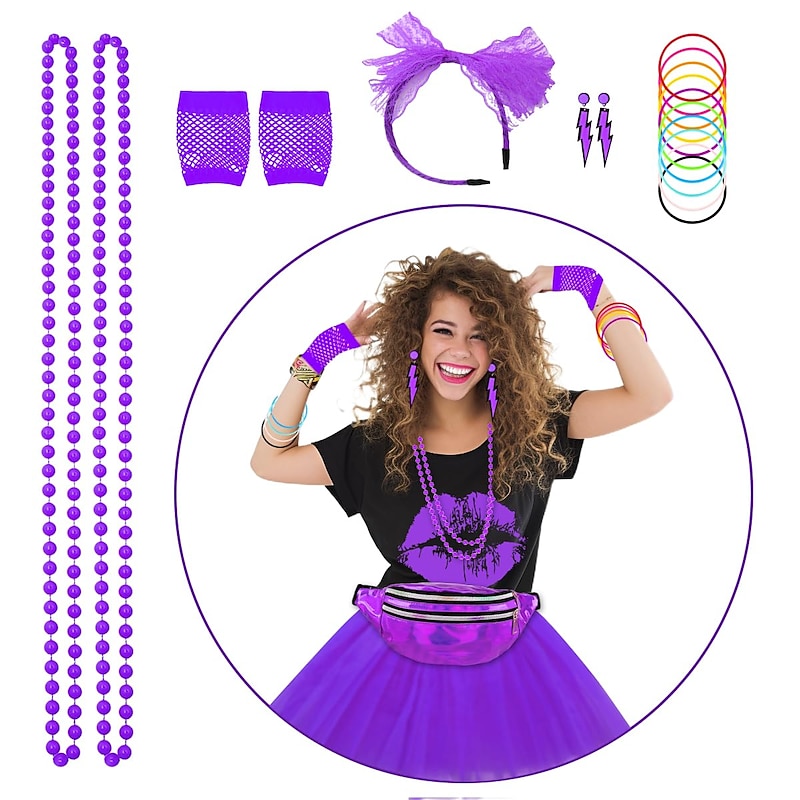 Package Included 24PCS- 1 I Love 80's Print T-shirt, 1 tutu skirt, 1 pink fanny pack, 1 pair of fingerless short fishnet gloves, 1 pair of fingerless long fishnet gloves, 1 pair of leg warmers, 2 neon necklace, 1 lace headband,1 pair of flash earrings, 10 neon silicone bracelet,complete your demands on a 80's costume accessories.