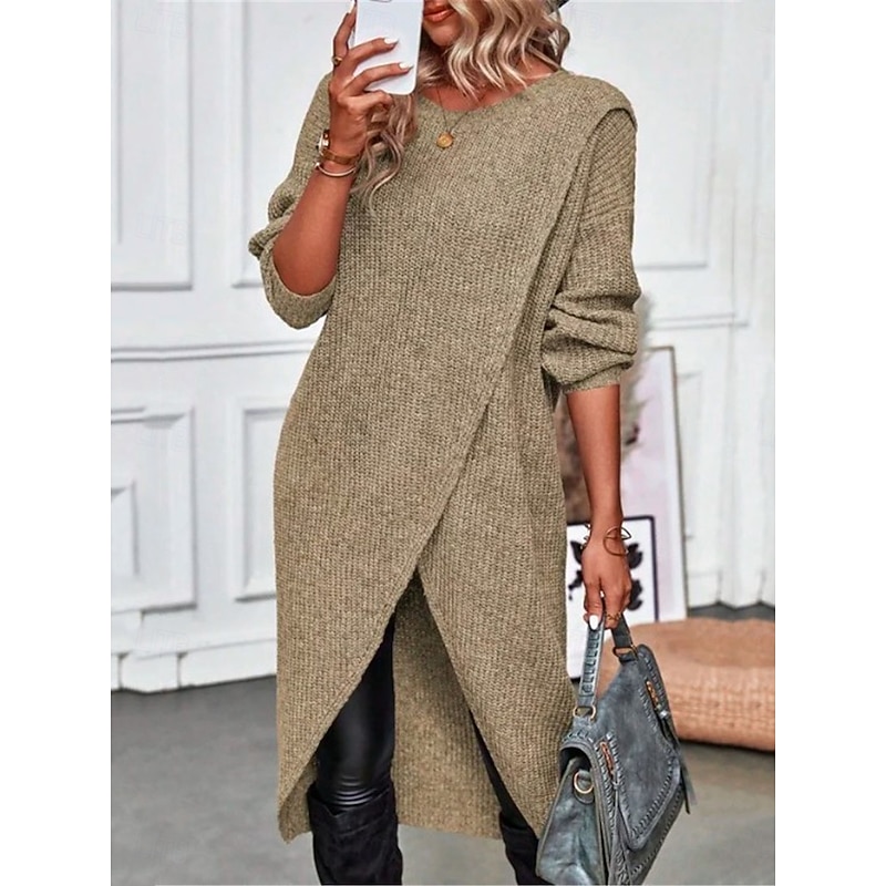Highlights [Fabric] : Crafted from high-quality polyester, this women's sweater offers a soft and cozy ribbed knit texture. Its micro-elastic quality ensures both comfort and a perfect fit, making it an excellent choice for fall and winter seasons. [Fit Type] : Designed with a regular fit, this sweater dress provides a relaxed yet elegant silhouette. Its long sleeve design adds to the warmth and comfort, perfect for maintaining style in cooler weather. [Design Highlights] : The sweater features a classic crew neck and a sophisticated wrap design with an asymmetrical hemline, adding a modern and chic touch to your wardrobe. The neutral pure color palette, including green, gray, and khaki, allows versatile pairing with various outfits. [Occasions] : Ideal for daily outings, outdoor activities, and weekend gatherings, this sweater dress combines style and practicality. Its elegant design makes it suitable for both casual and semi-formal occasions, ensuring you are always dressed appropriately. [Size Notice] : Available in a range of sizes from S to XL, ensuring a suitable fit for various body types. Whether you're looking for comfort or a sleek style, this sweater dress meets diverse size preferences for a flattering look.
