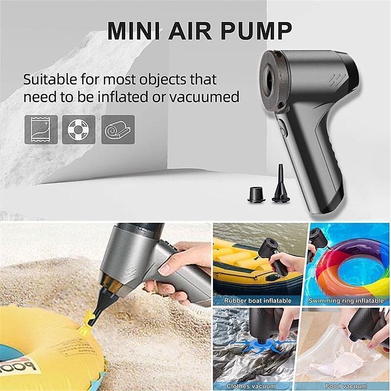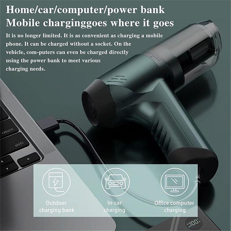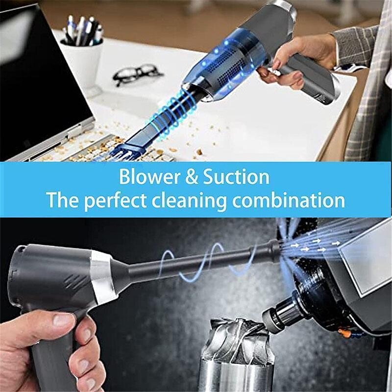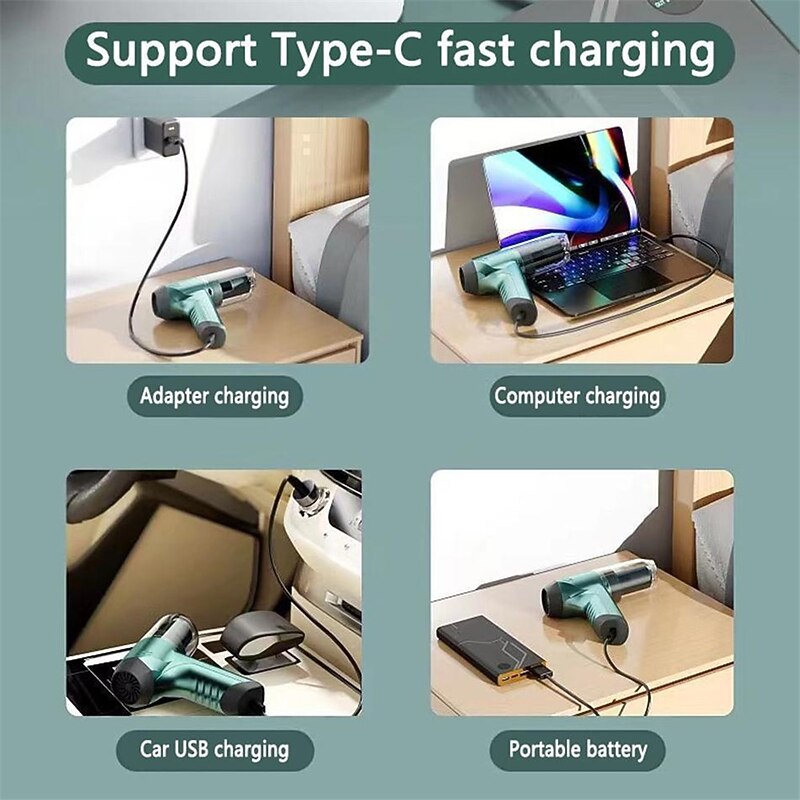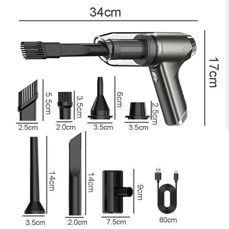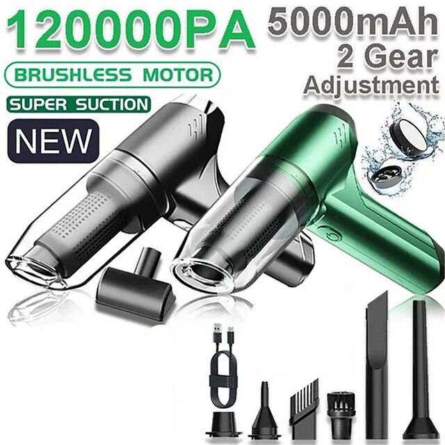 Highlights - 100% brand new high quality - New Upgraded Multifunctional Wireless Car Vacuum Cleaner - Vacuuming/Blowing/Inflating: Can perform various cleaning tasks such as vacuuming, blowing dust, and inflating balloons - Suitable for cleaning cars, vacuuming, blowing dust, blowing balloons - Can also be used for household storage bags pumping - Upgrade Longer blow nozzle Air Dust Blower & Extra wide floor nozzle Deluxe Set - Meets multiple cleaning needs for cars and homes - Powerful 120W Two gear adjustment Brushless motor - 1 Gear 60000PA/ 2 Gear 120000PA strong suction power - Can effectively clean pet hair, dust, debris, and paper - Cordless and portable design for convenient cleaning experience - Versatile with both vacuuming and blowing functions - Intelligent AI variable frequency motor for efficient cleaning - Dual filtration system to prevent clogging and maintain long-lasting suction power - Type-C fast charging for easy and worry-free charging - Comes with multiple accessories for cleaning various areas and surfaces - Compact size and lightweight for easy handling and storage - Available in Green/Silver gray color - Made of high-quality ABS material - Noise level ≤ 60dB for a quieter cleaning experience - Operating temperature range: - 20 ℃~+50 ℃ - Net weight: 0.38KG - Package includes various accessories for versatile cleaning tasks