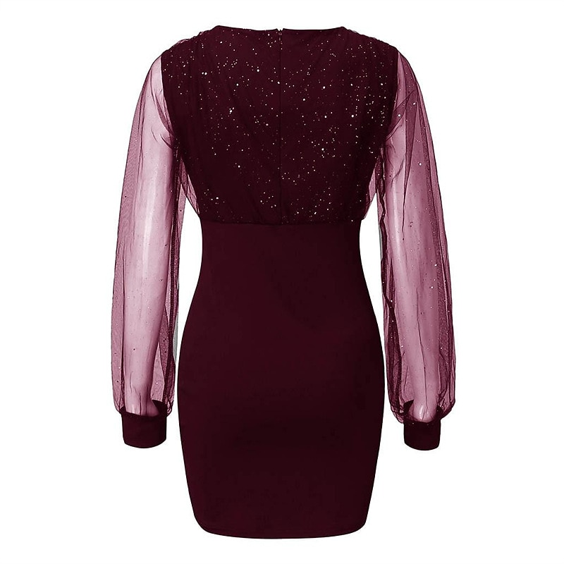 Highlights [Fabric]: Crafted from a premium polyester blend, this dress offers micro-elasticity for a comfortable fit that moves with you. The material is soft yet durable, ensuring you look and feel your best throughout any event. [Silhouette]: This dress features a sheath silhouette that hugs your curves in all the right places, enhancing your figure while maintaining an elegant appearance. The length falls into the mini dress category, adding a modern and youthful touch to the classic design. [Design Highlights]: The stylish V-neckline and sheer mesh long sleeves with shimmering sequins make this dress a standout piece. The slightly puffed sleeves provide a contemporary twist, while the delicate sequin details catch the light beautifully, delivering an eye-catching shimmer. [Occasions]: Ideal for cocktail parties, evening events, and homecoming occasions, this dress is designed to make a memorable impression. Its sophisticated yet trendy design ensures you will be the center of attention at any event. [Size Range]: Available in a wide range of sizes from S to XXL, this dress caters to various body shapes, allowing all women to find their perfect fit and feel confident.