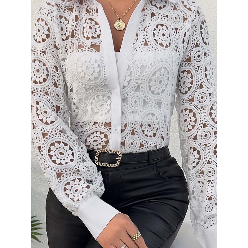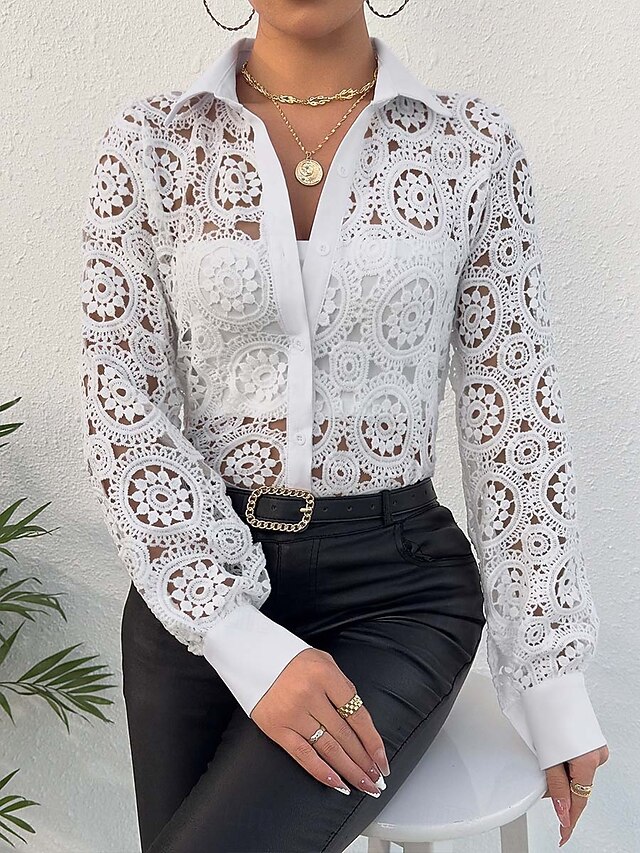 Women's Lace Splicing Top Elegant Long Sleeve V Neck Regular Tops White Summer Spring 7