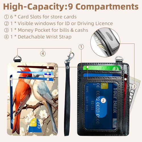 Credit Holder Slim Wallet, PU Leather RFID Blocking, Women & Men Front Pocket Small Card Holder, Credit Card Wallet with Wristlet, Convenient Travel Business, Two Birds 6