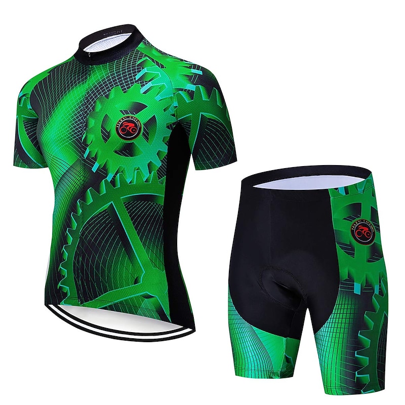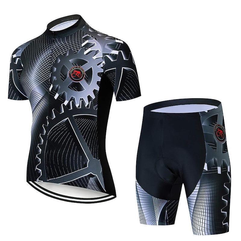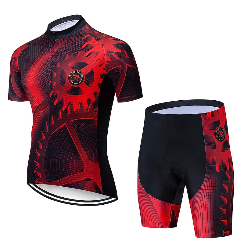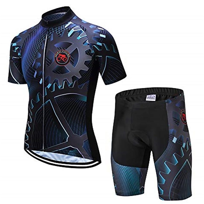 Highlights - Classic 3-pockets behind the cycling shirts to store essentials like your wallet, maps and snacks. - High-quality polyester fabric with 80% polyester and 20% spandex for great moisture-wicking, breathability, and quick-drying. Feel more comfortable during your ride. - Four-way stretchy crotch with high elasticity avoids the embarrassment of torn fabric. - Anti-slip elastic leg grippers and elastic silicone strap of jersey to keep compressed and tight and prevent slipping. - Compression fit for increased mobility and muscle support. - Flatlocked seams provide comfort and flexibility during long-distance cycling. - 3D thickened foam padding with gel padding inside fits nicely around your hips without slipping, protecting your hipbone from injuries. - Perfect for Mountain Bike MTB and Road Bike Cycling activities. - Available in men's sizes, stretchy and elastic, suitable for both athletic and athleisure occasions. - Gear pattern design with quick-dry and moisture-wicking function, ideal for those intense and active cycling moments.