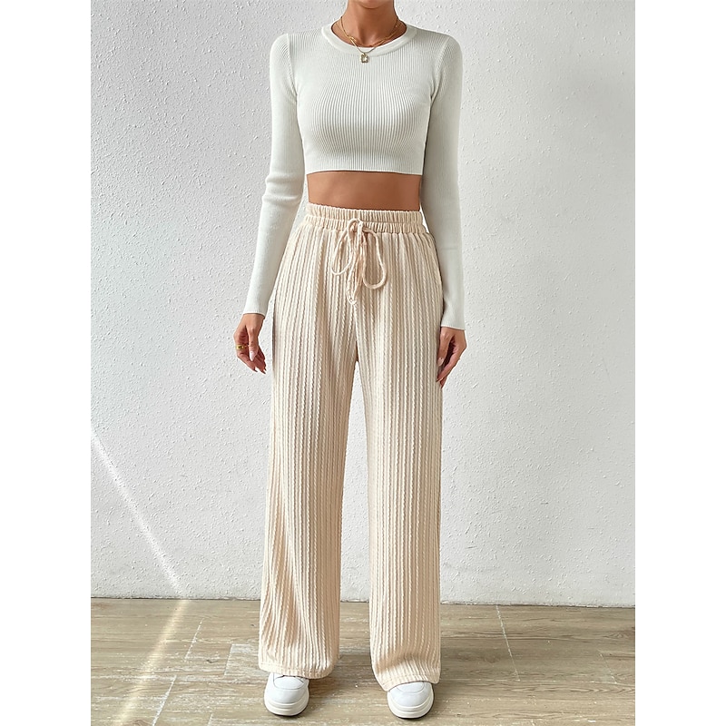 The pants boast a chic, wide-leg silhouette and high waistline, offering both style and comfort. With functional pockets and a high cut, straight leg design, these pants are both practical and fashionable. The elastic waistband, complete with an adjustable drawstring, provides a tailored and adaptable fit.
