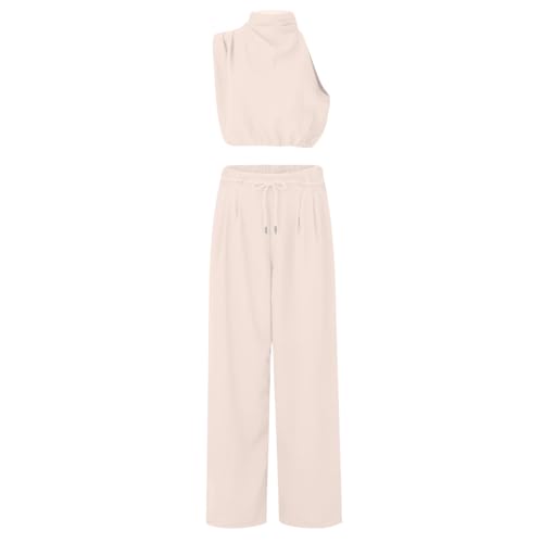 HGps8w 2 Piece Outfits for Women Dressy Satin Mock Neck Sleeveless Crop Top Blouse & Wide Leg Pants Elegant Office Party Sets 2