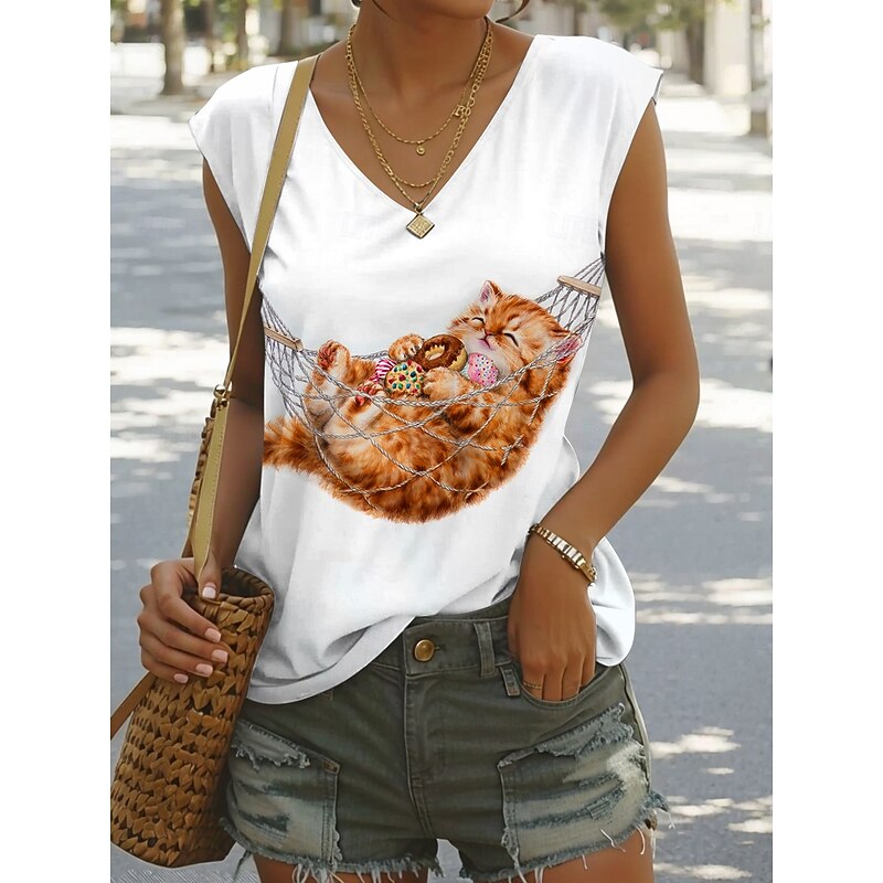 Kayomi Harai Women's Camisole Tank Top Graphic Animal Cat Stylish Classic Casual Sleeveless V Neck Regular Tops Daily Print Black White Yellow Summer Spring 2