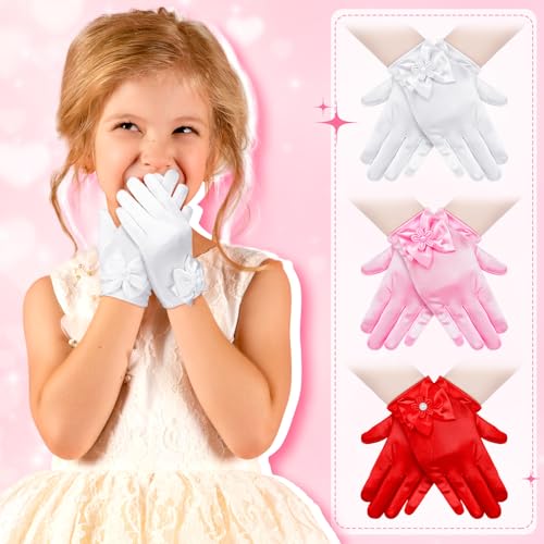 Bencailor 3 Pieces Girls Satin Gloves Tea Party Little Girls Princess Dressing Gloves for Wedding First Communion Cosplay(Bow Dress Style, White, Red, Pink) 3