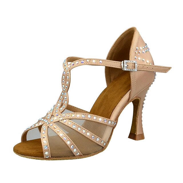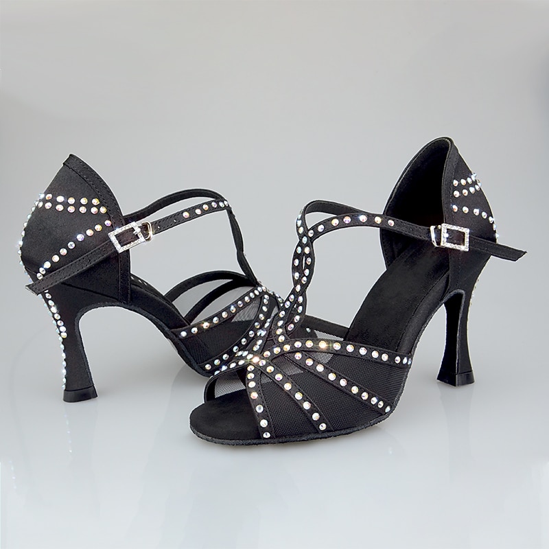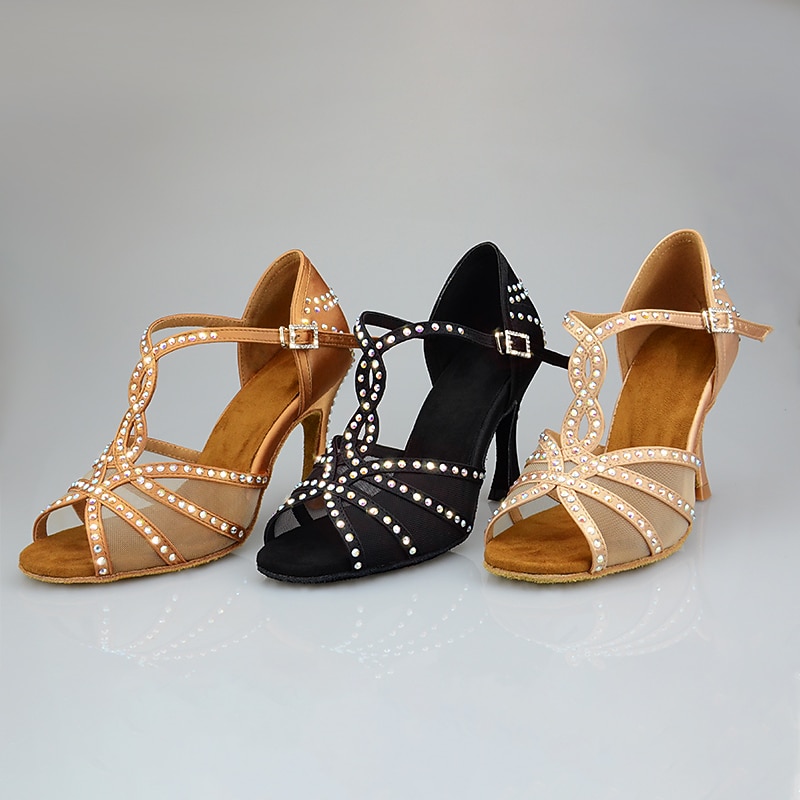 Highlights Elegant Latin Dance Shoes Highlights: [Fabric]: Crafted with luxurious satin, these women's Latin dance shoes exude elegance and sophistication, promising a soft and comfortable feel throughout your performance. [Silhouette]: Featuring a graceful flared heel, these shoes combine style and practicality with a heel height ranging from 3 to 4 inches, providing the ideal elevation for elegance without compromising stability. [Design Highlights]: The T-strap design adorned with sparkling rhinestones and delicate tulle embellishments offers a touch of glamour, making these shoes perfect for special performances and evening events. The adjustable buckle ensures a secure and customized fit, while the suede outsole provides excellent grip and flexibility for effortless movement on the dance floor. [Occasions]: Perfect for performance, training sessions, and parties. These shoes are designed to add charm and style to any occasion, making them a versatile addition to your dance wardrobe. [Size Range]: Available in a variety of sizes from US3.5 to US12.5, ensuring a comfortable fit for different foot sizes and preferences. Suitable for women seeking both style and performance in their footwear.