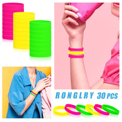 Ronglry 30pcs Neon Bracelets 80s Silicone Friendship Bracelet Bulk Colorful Silicone Wristbands Stretch Neon Bracelets for Glow Party Halloween Costume Accessories 80s Jewelry for Women Men 3